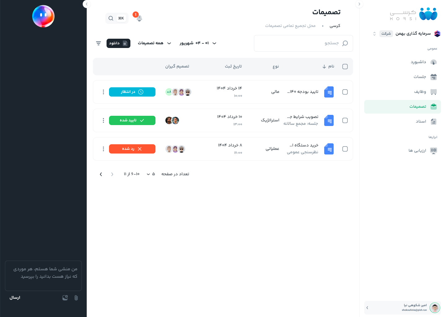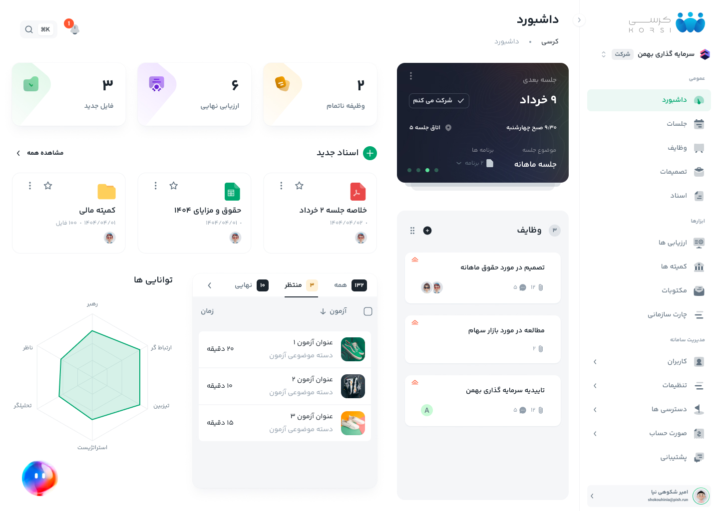 یک نمای کلی و شخصیسازی شده از تمامی فعالیتهای هیئت مدیره. داشبورد کرسی، با تلفیق دادههای کلیدی، خلاصهای شفاف از وضعیت شرکت، مصوبات، وظایف در انتظار و آمارهای مهم را به شما ارائه میدهد.