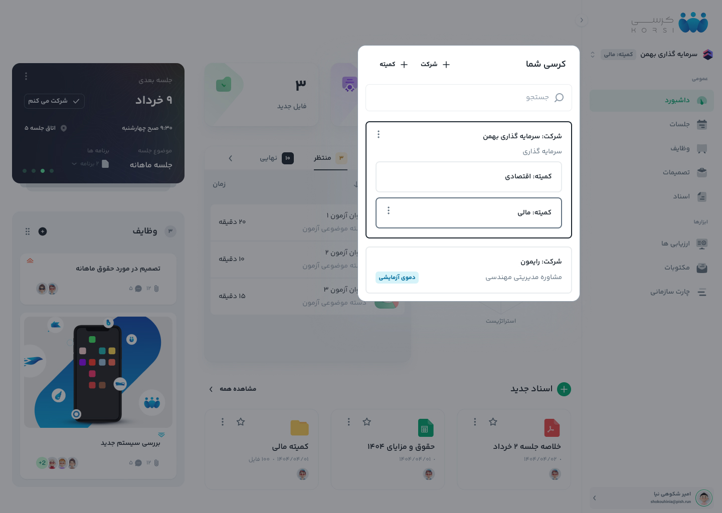 با چند کلیک ساده، کرسی را برای هیئت مدیره خود فعال کنید. از تنظیمات اولیه شرکت و دعوت اعضا تا شخصیسازی داشبورد و ساختار کمیتهها، همه چیز تحت کنترل شماست.